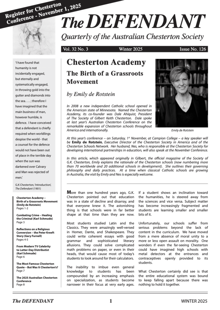 To be a member of the Australian Chesterton Society is easy and fast. Join today! As part of your membership, you’ll receive by post, email or both, our quarterly newsletter, The Defendant.